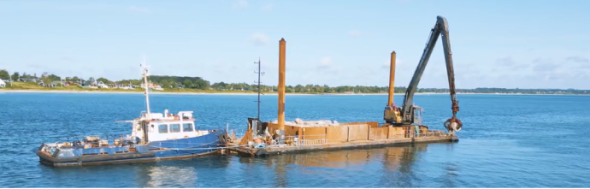 Idag er Vesta Fjord startet på Egmont Revet. Prammen er lige ud for Egmont Broen for at starte med de bunker sten, som skal vise vejen ud til selve revet.